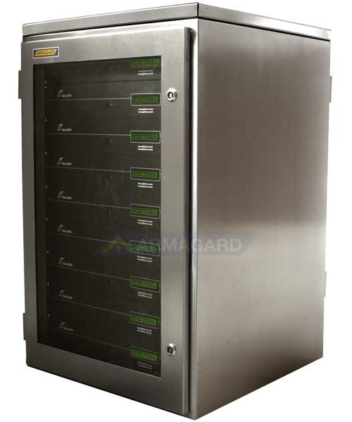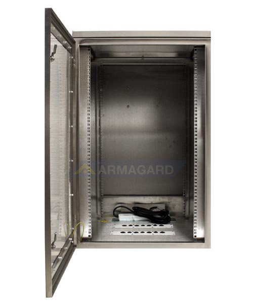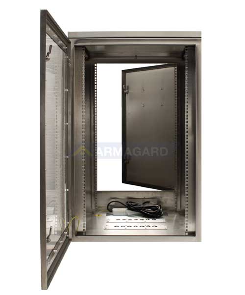 L'armoire rack de la série 700 d'Armagard est une armoire de protection qui peut contenir un équipement rackable jusqu'à une capacité maximum de 18U. Construite selon les normes IP65, cette armoire en acier inoxydable peut protéger des appareils dans des conditions mouillées ou humides et elle est idéale pour les halls de préparation d'aliments ou les emplacements qui subissent des lavages.