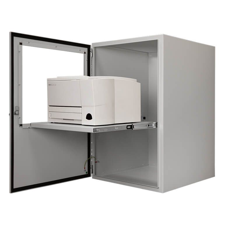 PPRI-700 est un capot pour imprimante sur pied qui peut être réalisé avec une multitude d'options et de variantes, allant d'une tablette coulissante, d'une tablette fixe, d'une porte avant et/ou d'une porte à l'arrière, d'une trappe pour les étiquettes, d'une porte vitrée, de modules chauffants pour les environnements réfrigérés, de roulettes à un pied pour permettre les nettoyages et les déplacements faciles.